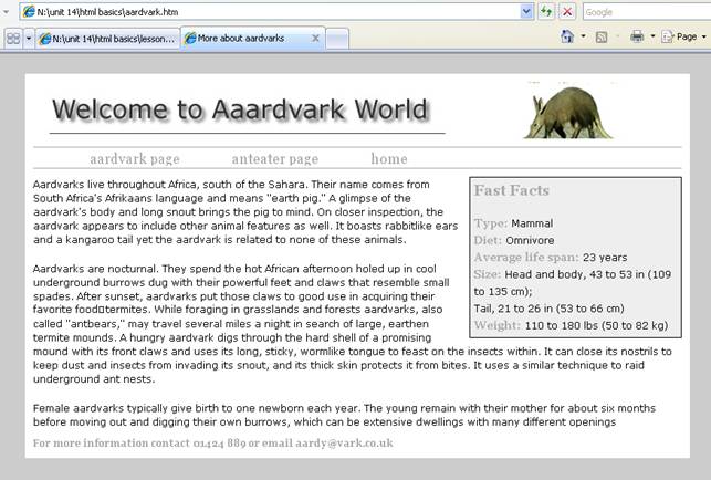 This is lesson two in the simple webpage primer don’t do this one until you have had a go at making the basic page and stylesheet as I am assuming you have got Aardvark world under way