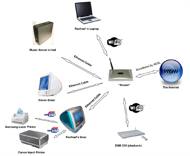 Below is a diagram of our network at home. It shows all the devices we use and the types of connections between them. Click on each device for some notes on what is does and how it does it.