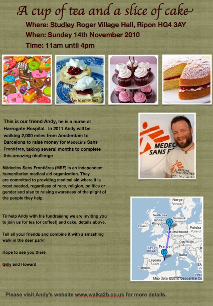 A cup of tea and a slice of cake - What can I say? I continue to be amazed at the kindness, generosity and commitment of my friends. Gilly Spence and Howard Richardson ran a Tea /Coffee/Bun/Cake riot in Studley Roger today. It was to say the very least a success. I was in Studley earlier in the week and gave a talk about the walk . Today I spent 5 hours chatting and drinking tea with the customers while the workers slaved away over hot sinks and kettles in the kitchen.